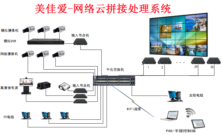 網絡云拼接處理系統采用純硬件構架,以高帶寬網絡交換技術為手段,以基于像素的圖像縮放引擎為基礎,采用分布式的模塊化設計,實現大屏幕拼接墻靈活,穩定,方便,高性能的顯示控制解決方案。