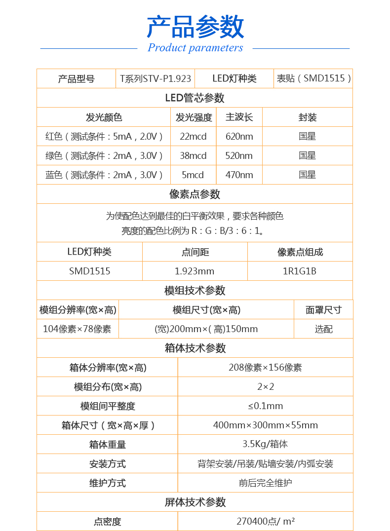 LED大屏幕小間距拼接全彩高清屏 背光源:LED背光 點間距:1.923 mm LED燈種類:SMD1515 顯示密度:270400點/㎡ 模組分辨率(寬×高):104像素×78像素 模組尺寸(寬×高):(寬)200mm×( 高)150mm 箱體分辨率(寬×高):208像素×156像素 模組分布(寬×高):2×2 箱體尺寸(寬×高×厚):400mm×300mm×55mm