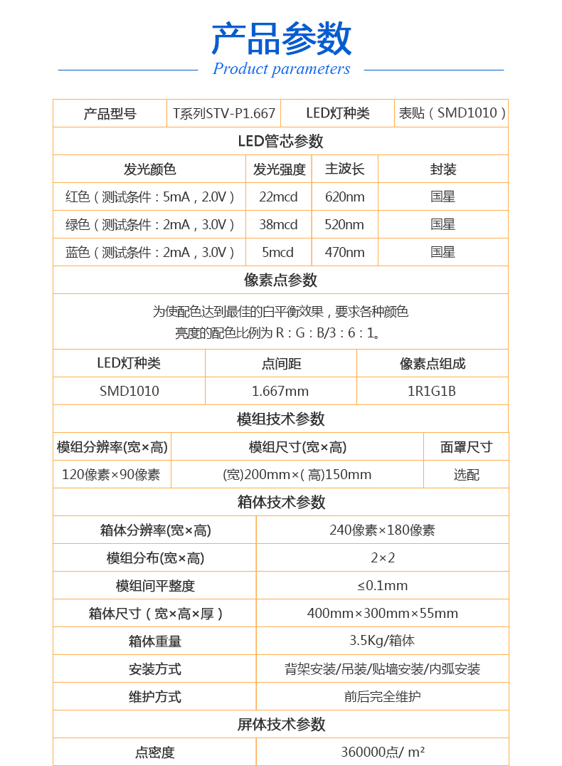 LED大屏幕小間距拼接全彩高清屏 背光源:LED背光 點間距:1.667 mm LED燈種類:SMD1010 顯示密度:360000點/㎡ 模組分辨率(寬×高):120像素×90像素 模組尺寸(寬×高):(寬)200mm×( 高)150mm 箱體分辨率(寬×高):240像素×180像素 模組分布(寬×高):2×2 箱體尺寸(寬×高×厚):400mm×300mm×55mm