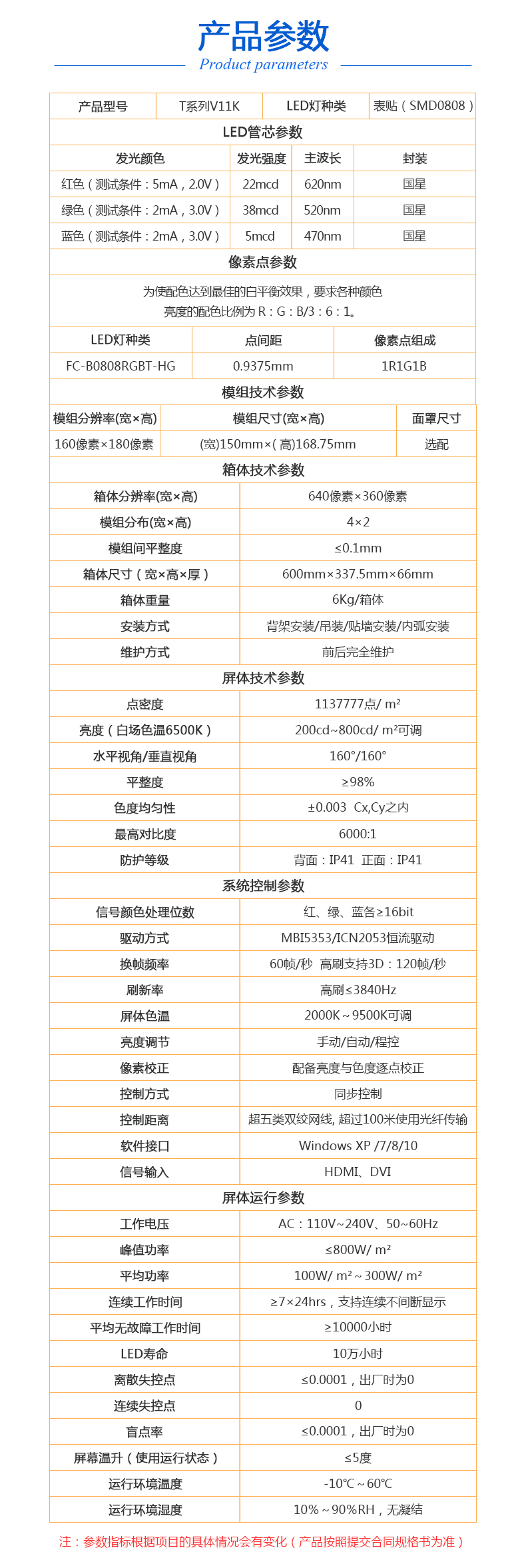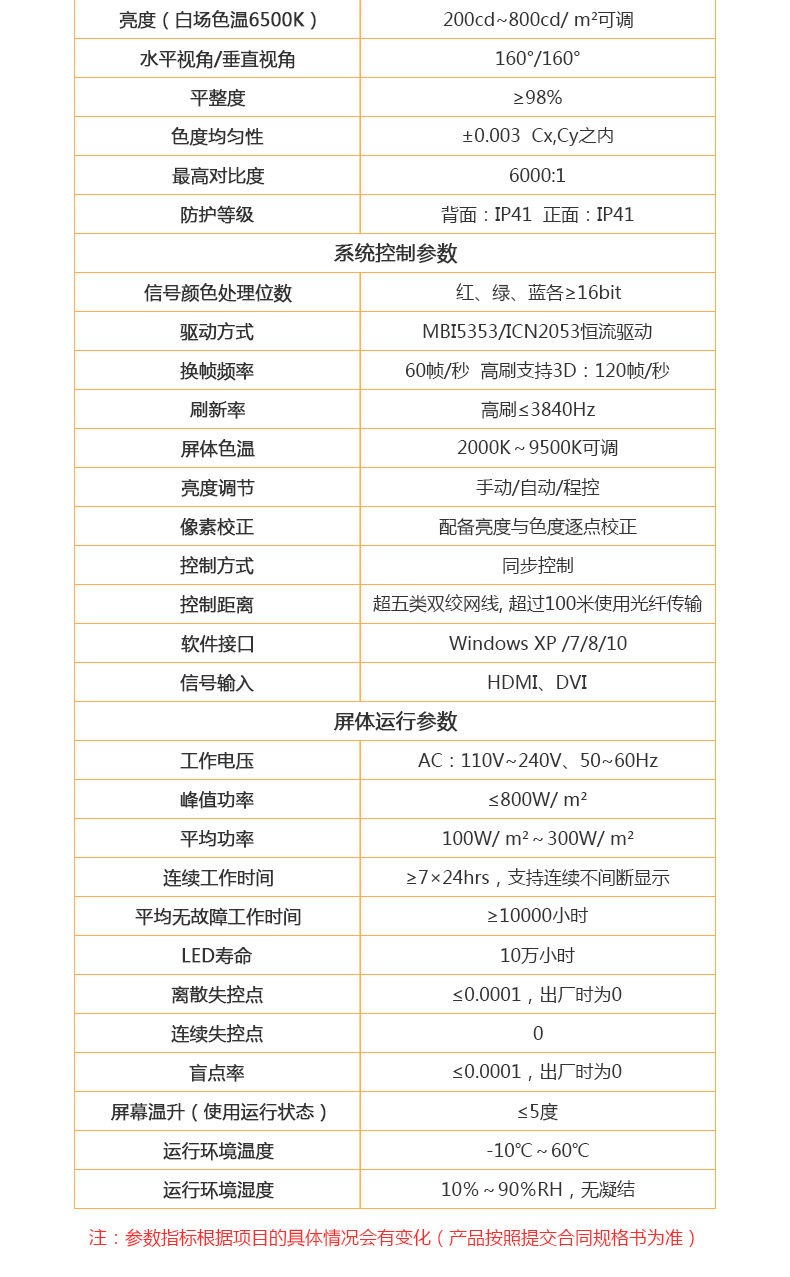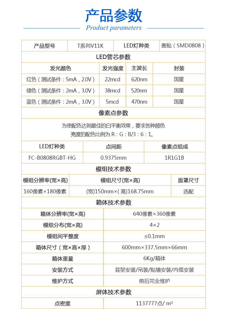 LED大屏幕小間距拼接全彩高清屏 背光源:LED背光 點(diǎn)間距:09375 mm LED燈種類:SMD0808 顯示密度:1137777點(diǎn)/㎡ 模組分辨率(寬×高):160像素×180像素 模組尺寸(寬×高):(寬)150mm×( 高)168.75mm 箱體分辨率(寬×高):640像素×360像素 模組分布(寬×高):4×2 箱體尺寸(寬×高×厚):600mm×337.5mm×66mm